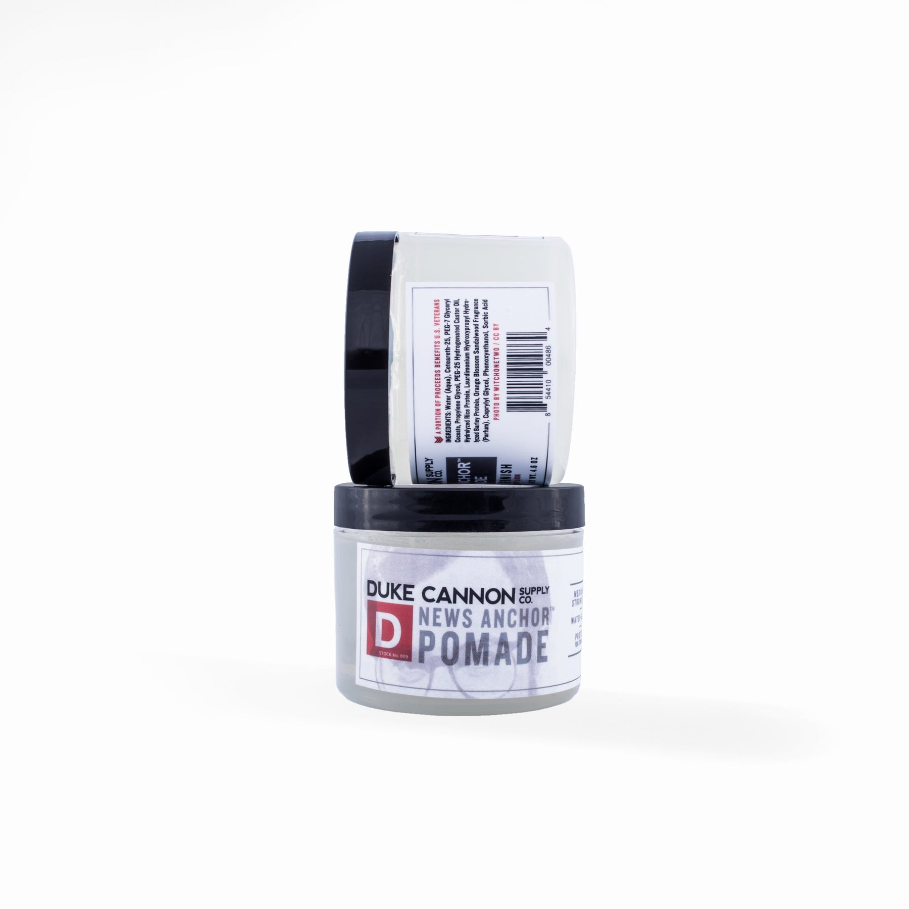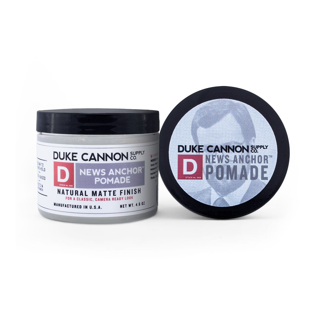 Duke Cannon’s News Anchor Pomade works on all hair types, delivering a natural matte finish to provide a classic, camera-ready look. Offers a medium-to-strong hold and a protein blend that strengthens and repairs your hard-working crown. Prepare your hair for award-winning, 'round the clock coverage with Duke Cannon’s News Anchor Pomade.
