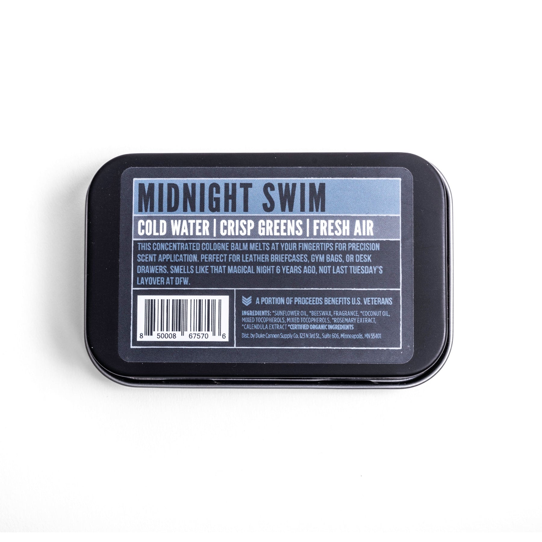 Inspired by the pure refreshment of a moonlit cannonball into the dark blue water of a remote forest lake, Midnight Swim offers a sophisticated blend of cold water, fresh air, and crisp green notes for a modern, slightly alluring, scent, perfect for a night not soon forgotten.